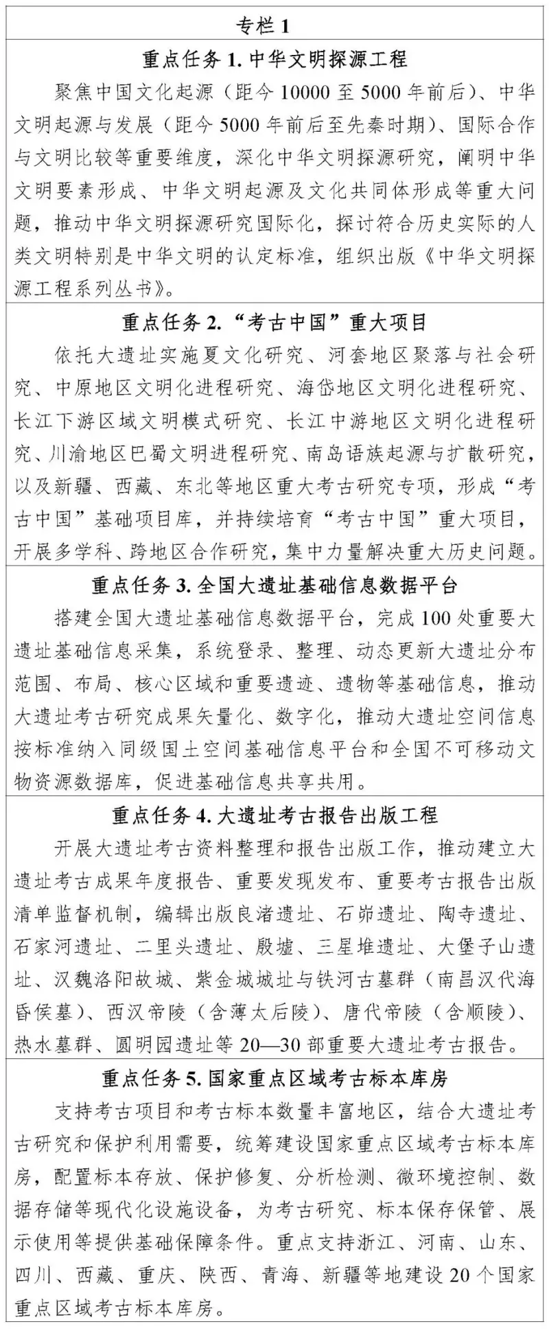 深入推進中華文明探源研究、“考古中國”重大項目,支持重要大遺址編制中長期考古工作計劃,系統持續開展考古測繪、調查、勘探和發掘,搭建全國大遺址基礎信息數據平臺。實施考古報告出版工程,做好考古成果的挖掘、整理、闡釋和國際傳播工作。支持央地共建、省地共建、校地共建考古工作基地(站),建設20處國家重點區域考古標本庫房,實現區域考古標本管理現代化、規范化。