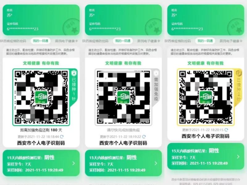 | 內容概述 | 為加快推進我市新冠病毒疫苗接種工作,提醒廣大市民及時進行加強免疫,現對“西安一碼通”疫苗接種信息及提示內容進行了如下調整:1.對于已接種兩劑次滅活疫苗的人群,顯示“已接種2針”,邊框及字體調整為綠色;接種第一劑次滿6個月以上的,提示內容為“請盡快完成加強免疫”,一碼通邊框及字體調整為灰色;完成加強劑次接種后,一碼通邊框及字體恢復為金色,標識內容為“已接種3針”; | ||||