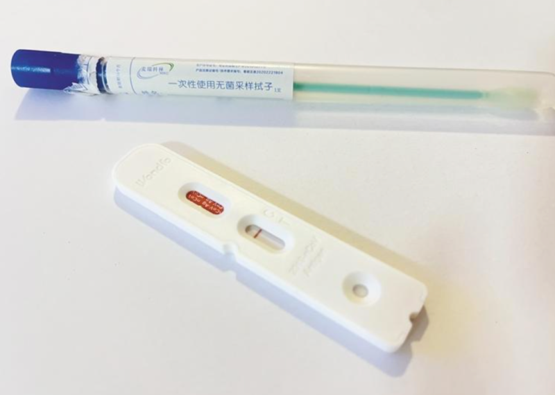 采樣完成后,記者將采集樣本后的拭子立即置于樣本提取管中,并將拭子頭在提取液中旋轉混勻。混勻30秒后用手隔著樣本提取管外壁擠壓拭子頭,確保樣本充分洗脫于管中,并蓋上蓋子。靜置1分鐘等待樣本盡可能溶解于溶液中后,記者擰開樣本提取管頂部的透明帽子,向測試卡加樣孔滴入處理后的樣本提取物。最后根據試劑說明書,等待15-20分鐘進行結果判讀。C和T處同時顯示橫杠便是陽性,只有C處顯示橫杠則是陰性,如果C處沒有顯示橫杠則說明本次檢測是無效的,需要重新采樣進行檢測。