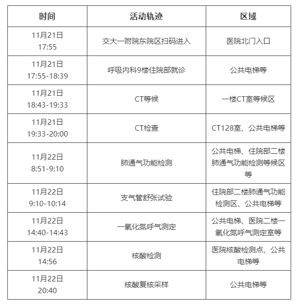 11月23日00時(shí)30分,閻良區(qū)在交大一附院東院(原141醫(yī)院)就診病人核酸檢測中發(fā)現(xiàn)1名初篩陽性人員。經(jīng)初步流調(diào),該病例有關(guān)活動(dòng)軌跡如下: