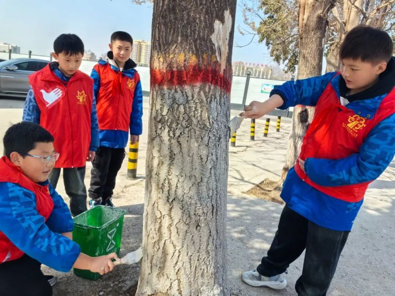 西飛一小學生自愿帶綠色植物進班級,給樹木穿上防蟲殺菌的“防護服”。成立“添綠”小隊,開展清理垃圾、落葉、擦花壇、養護綠化(清理垃圾)等活動。