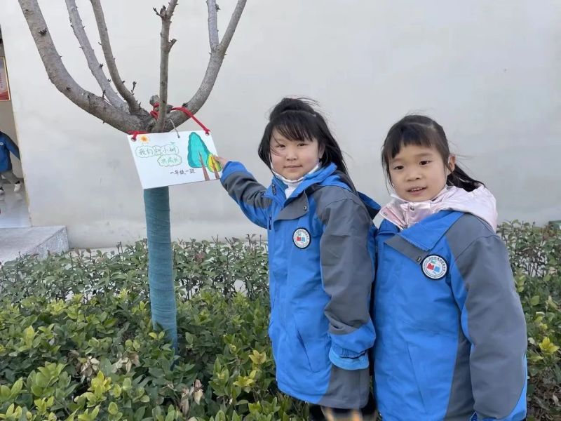 關山四維小學開展以“擁抱春天,‘植’此青綠”為主題植樹活動,各班在校園里各自認領一棵樹,并在樹上掛上班牌。