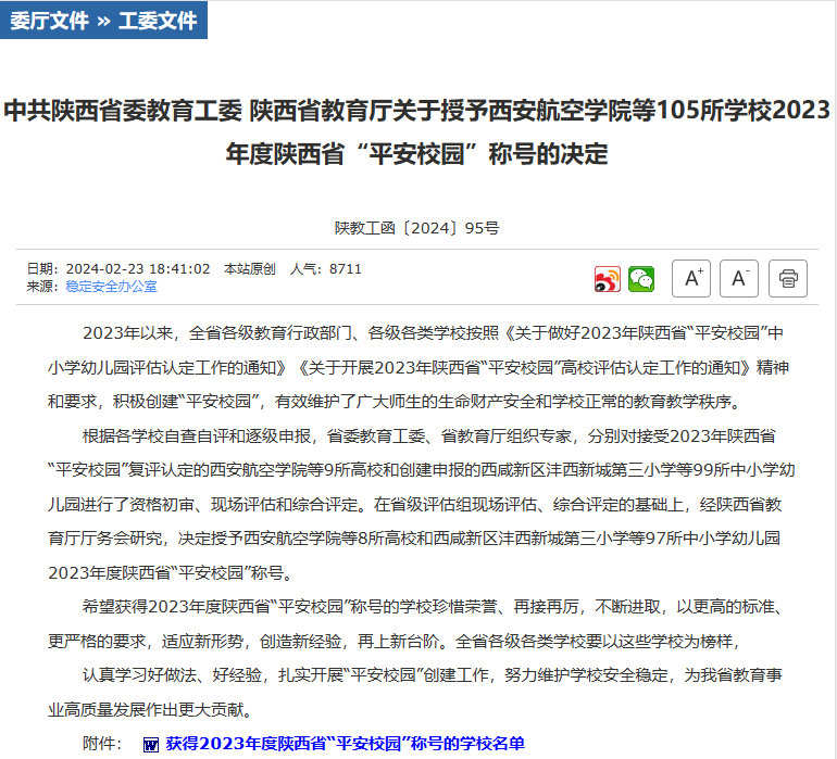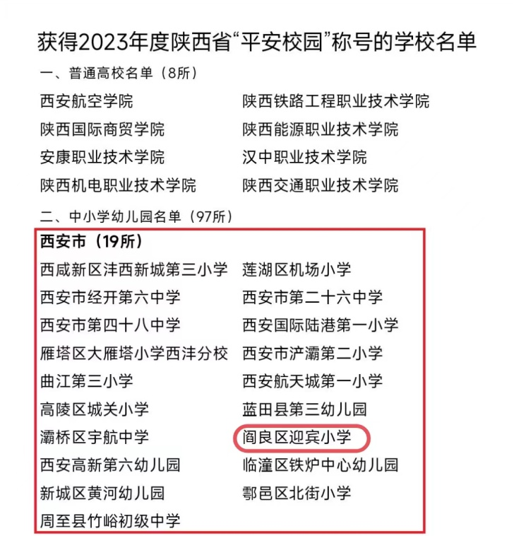 近日,在中共陜西省委教育工委陜西省教育廳公布的名單中,閻良區迎賓小學榮獲陜西省“平安校園”稱號。