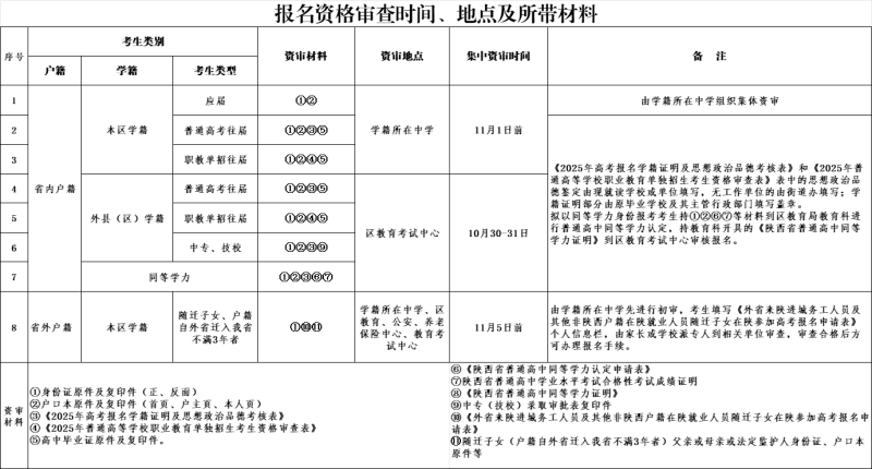 所有擬在陜參加2025年普通高考和職教單招報名的考生須于2024年11月1日9:00至7日17:00登錄陜西省教育考試院門戶網站(網址:https://www.sneea.cn)或陜西招生考試信息網(網址:https://www.sneac.com)完成網上報名并繳費,逾期未報名者責任自負。