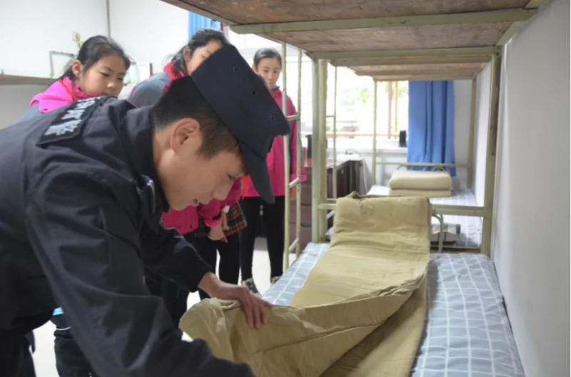 特警戰士的生活是緊張又有序的,他們不僅有著過硬的專業素質,內務能力也是相當了得,學生在特警警員帶領下一起參觀他們的內務。走進干凈的宿舍,看到床上整整齊齊疊放的豆腐塊般大小的被子,孩子們一個個驚訝極了!聆聽公安特警的生活常規,隊員們不得不豎起大拇指,決心努力提高生活自理能力,養成良好的生活習慣。