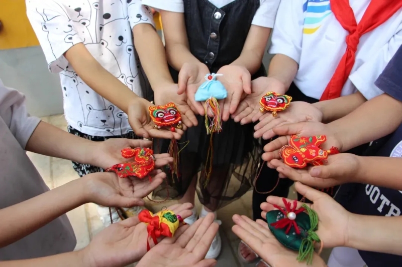 傳說端午節人們都會系五彩線,戴香包,用以避邪驅瘟,同學們動手制作傳遞祝福,互系五彩線,祈求吉祥、安康!