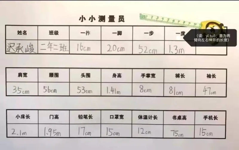 紙上得來終覺淺,絕知此事要躬行。當數學實踐性活動和我們的生活結合在一起時,數學就有了煙火氣。西飛四小“名校+”的學生們各顯神通,用小小身體丈量米、厘米,完成數學測量作業。