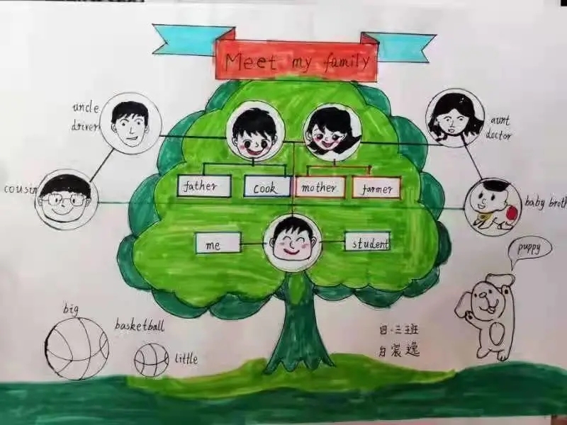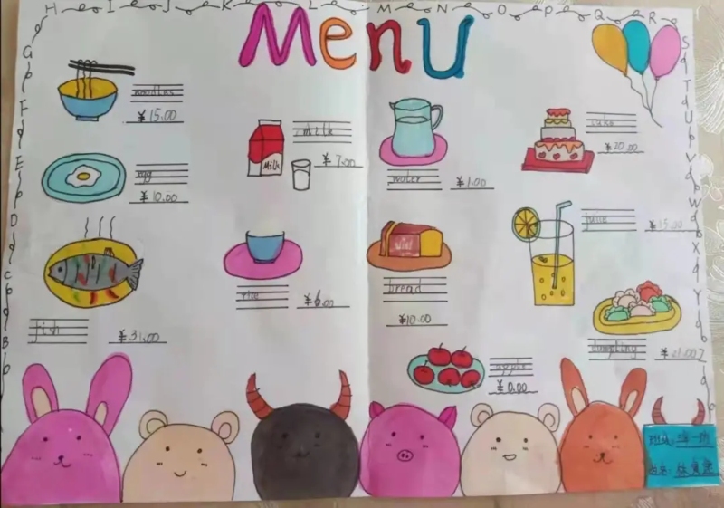 畫一張餐廳菜單,介紹我的午餐生活,畫一張家庭畫像,介紹我的家庭成員。迎賓小學的英語作業,激發了學生們對英語讀寫說的興趣,營造出了濃厚的英語學習氛圍。