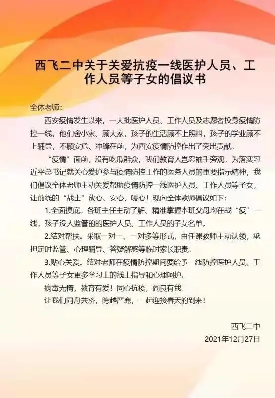 冬至日,組織開展致謝“大白”活動,學生們在核酸檢測時,向醫護人員鞠躬敬禮,表達理解、尊重與感謝之情,讓堅守在一線的“大白”們感受到寒冬里的溫暖!學生家長中有部分醫務人員、公安干警、社區工作者及志愿者等特殊群體,他們工作忙,照顧子女困難。他第一時間發出“關愛抗疫一線醫務人員、工作人員子女的倡議書”,通過暖心問候,緩解學生焦慮情緒,增強學生戰勝困難的勇氣和信心,解決家長的后顧之憂。