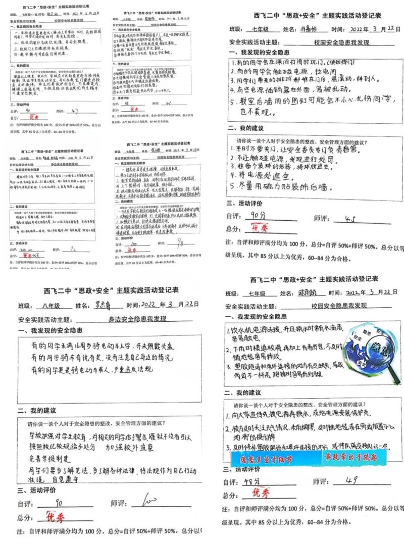 西飛二中創新安全教育形式,開展了“思政+安全”主題實踐活動,組織學生排查校園及身邊的安全隱患,學生帶著任務去找隱患、找問題,在尋找的過程中主動學習相關的安全知識和安全要求,引導學生樹立萬事安全第一、防患于未然的安全意識,提高安全防范能力。同時,學校根據學生發現的問題,建立問題臺賬,限期進行整改。