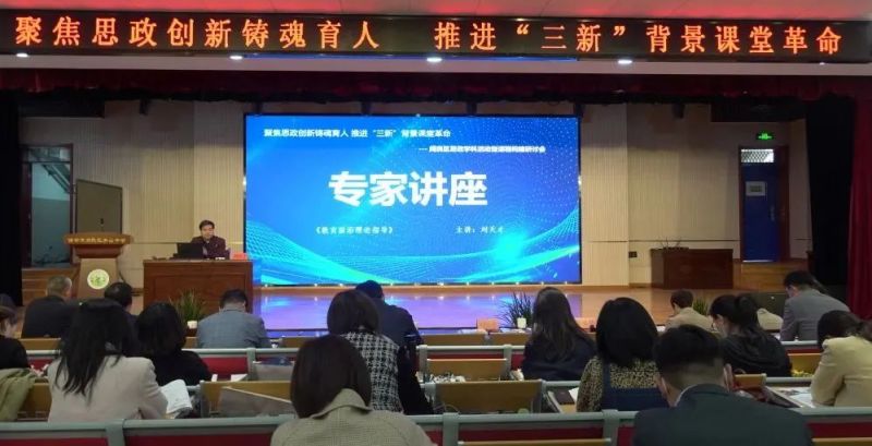 陜西師范大學基礎教育研究院副院長、課程中心副主任、教育評價研究所副所長劉天才作《教育前沿理論指導》報告。劉教授宏觀介紹了思政課教育的背景和內涵,闡述了思政教育的重要意義,使教師們深刻理解思政課程的重要性和必要性。