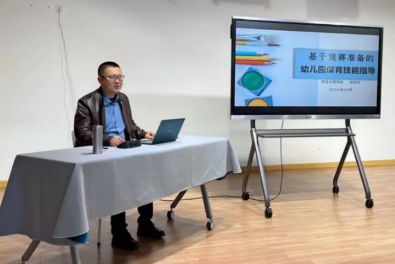 西安文理學院副院長趙四鴻教授進行了《基于競賽準備的幼兒園保育技能指導》專題講座,從入園離園、生活管理、衛生消毒、家長工作等方面,通過對標《指南》以及市級保育員技能大賽要求等,結合幼兒園實際案例分析,為參培教師詳細解讀保育員工作流程和操作規范,提升教師對于科學保育的認知。