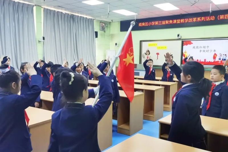 區級教學能手強利苗老師執教的二年級少先隊活動課,通過情景劇表演、歌曲聯唱、舞蹈等多種形式,展示了好少年應該具備的條件,使同學們明白了紅領巾的來歷和意義。