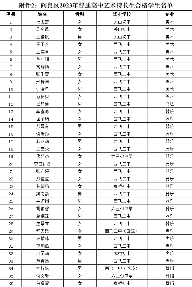 2.閻良區2023年普通高中藝術特長生合格學生名單