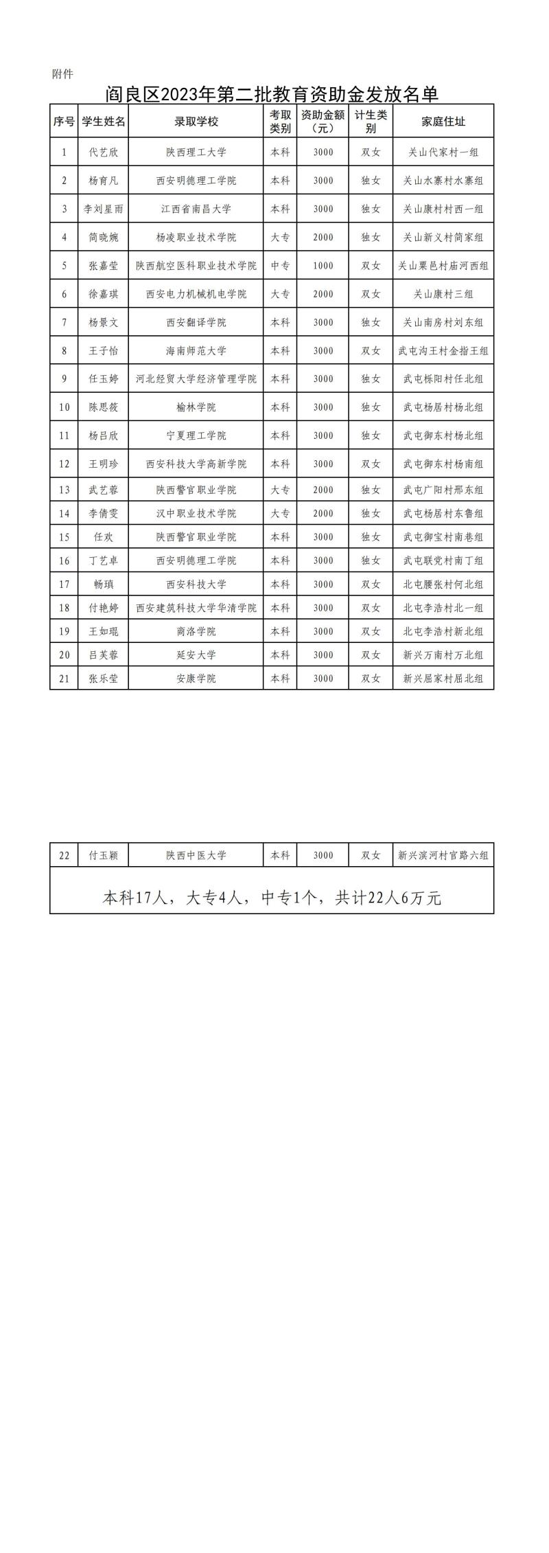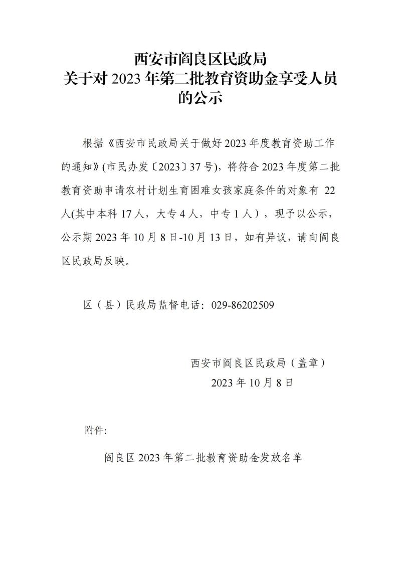 西安市閻良區民政局關于對2023年第二批教育資助(農村計劃生育困難女孩家庭)享受人員的公示