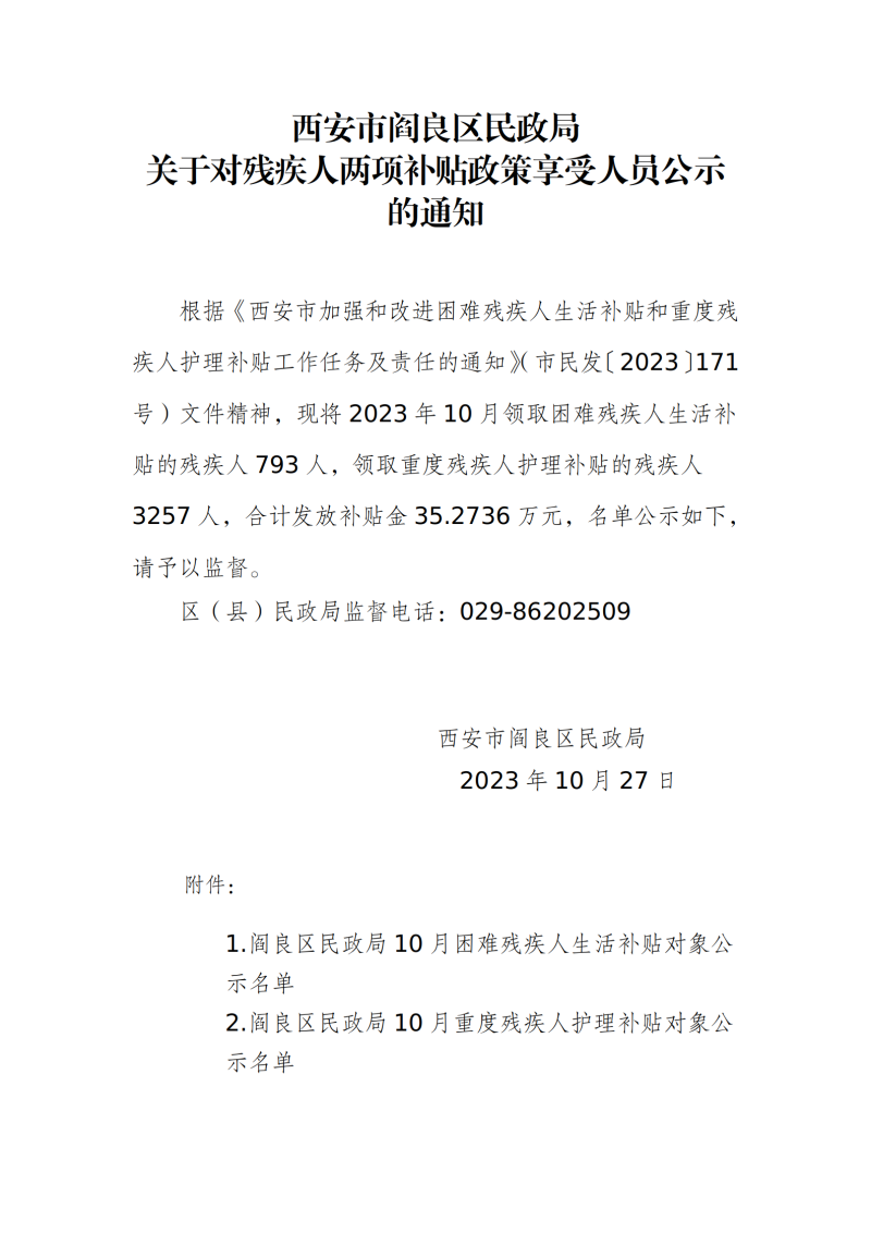閻良區民政局關于對2023年10月享受殘疾人兩項補貼人員進行公示