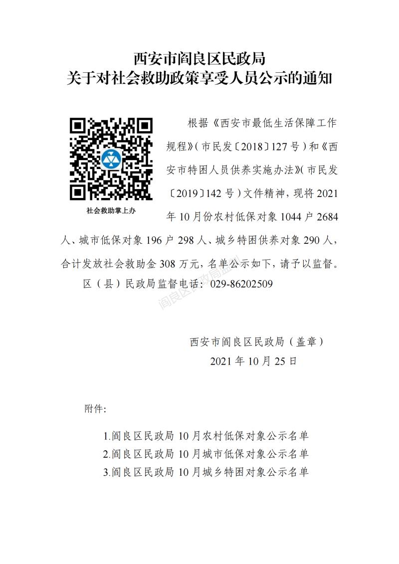 閻良區民政局關于對2021年10月社會救助享受人員進行公示的通知
