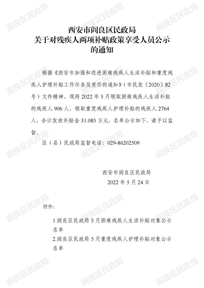 閻良區(qū)民政局關(guān)于2022年5月份殘疾人兩項補貼政策享受人員公示的通知