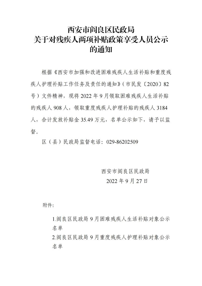 閻良區民政局關于2022年9月份享受殘疾人兩項補貼人員名單公示的通知