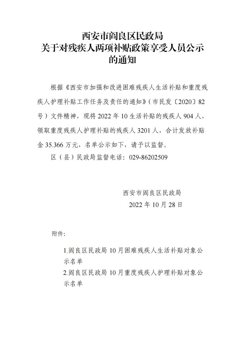 閻良區民政局關于對2022年10月份殘疾人兩項補貼政策享受人員公示的通知