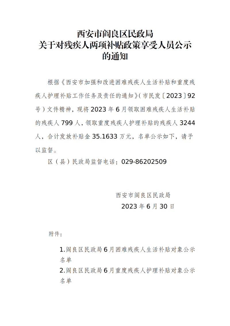 西安市閻良區(qū)民政局關(guān)于對(duì)2023年6月殘疾人兩項(xiàng)補(bǔ)貼對(duì)象進(jìn)行公示的通知