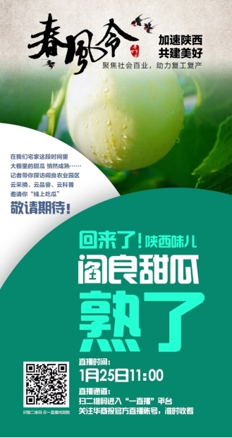 1月25日上午,華商報官方直播團隊走進閻良區甜瓜生產大棚,開展了“回來了!陜西味兒——閻良甜瓜熟了!”主題直播宣傳活動,聚焦閻良甜瓜產業,助力復工復產。華商報直播團隊通過園區負責人現場直播,重點向廣大網民介紹了閻良甜瓜生產現狀、技術優勢和上市情況,歡迎廣大市民群眾通過“線上”提前訂購。閻良區委宣傳部、區農業農村和林業局工作人員陪同。