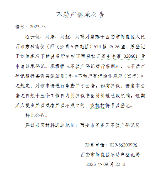 不動產(chǎn)繼承公告 編號:2023-75