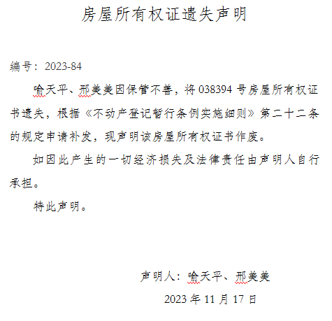 房屋所有權(quán)證遺失聲明 編號(hào):2023-84
