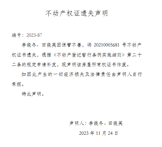 不動產權證遺失聲明 編號:2023-87