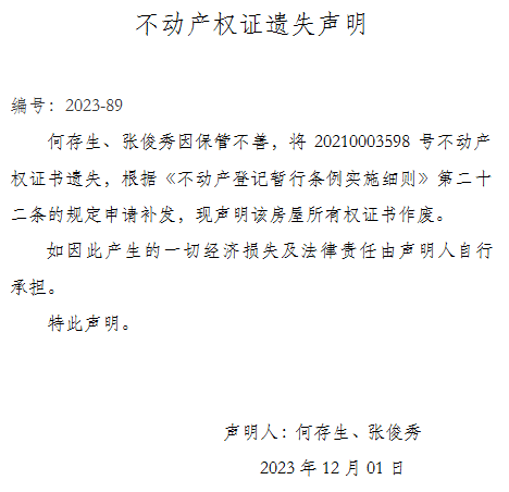 不動產權證遺失聲明 編號:2023-89