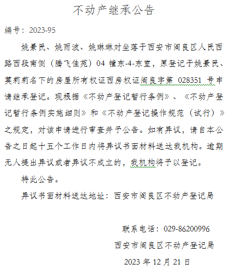 不動產(chǎn)繼承公告 編號:2023-95