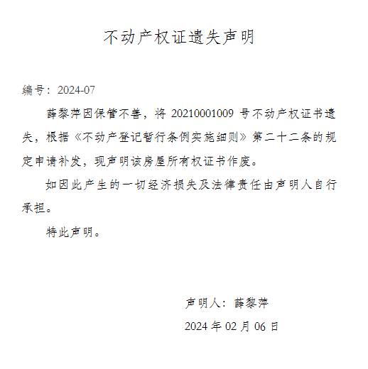不動產權證遺失聲明 編號:2024-07