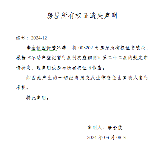 房屋所有權(quán)證遺失聲明 編號:2024-12