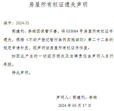 房屋所有權證遺失聲明 編號:2024-35