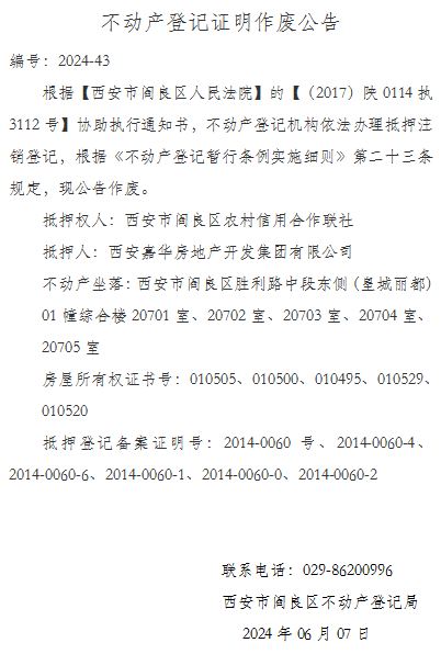 不動產(chǎn)登記證明作廢公告 編號:2024-43