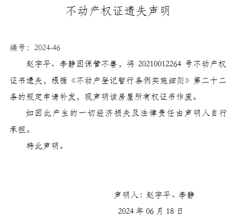 不動(dòng)產(chǎn)權(quán)證遺失聲明 編號(hào):2024-46