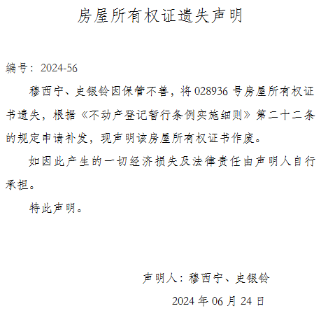 房屋所有權證遺失聲明 編號:2024-56