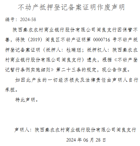 不動產抵押登記備案證明作廢聲明 編號:2024-58