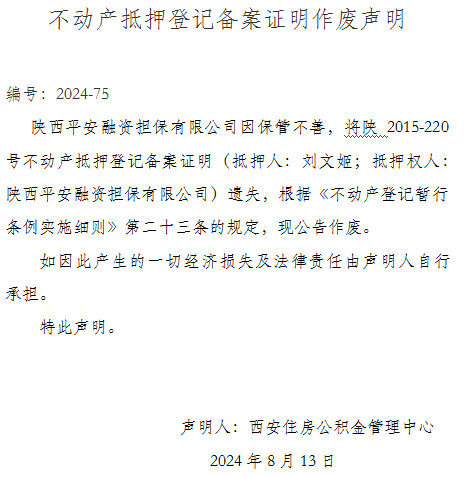 不動產抵押登記備案證明作廢聲明 編號:2024-75
