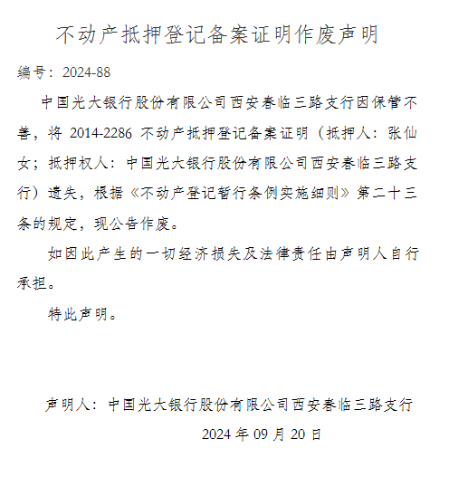 不動產抵押登記備案證明作廢聲明 編號:2024-88
