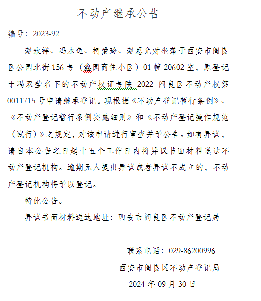不動(dòng)產(chǎn)繼承公告 編號(hào):2023-92