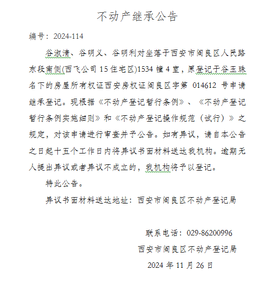 不動(dòng)產(chǎn)繼承公告 編號(hào):2024-114