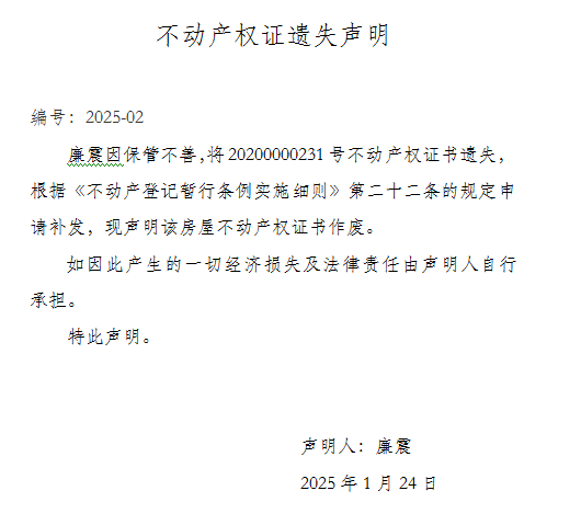 不動產權證遺失聲明 編號:2025-02