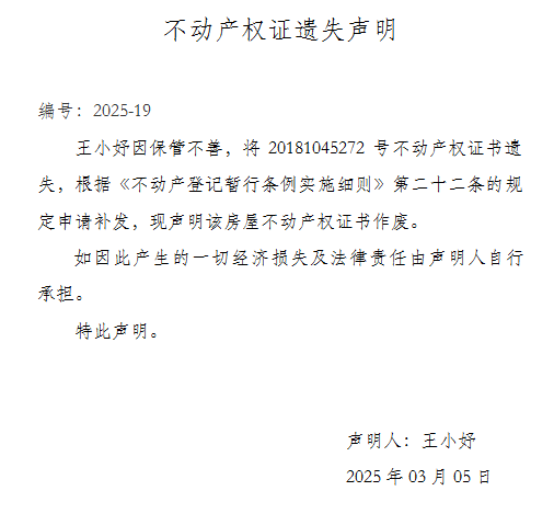 不動產(chǎn)權(quán)證遺失聲明 編號:2025-19