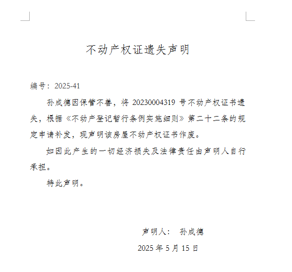 不動產權證遺失聲明 編號:2025-41