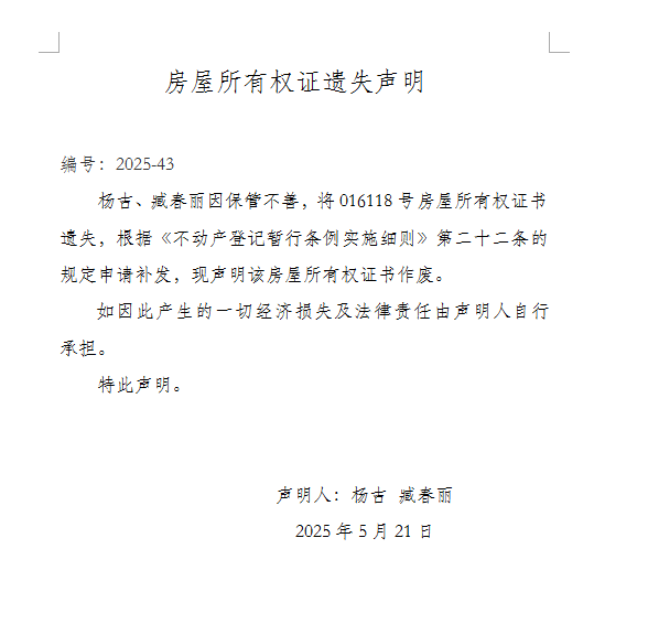 房屋所有權證遺失聲明 編號:2025-43