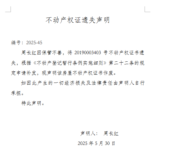 不動(dòng)產(chǎn)權(quán)證遺失聲明 編號(hào):2025-45