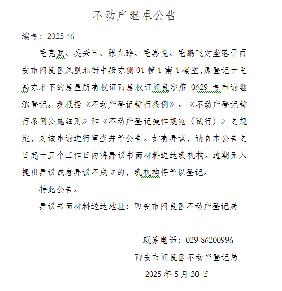 不動(dòng)產(chǎn)繼承公告 編號:2025-46