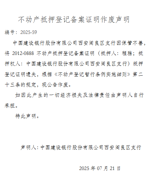 不動產(chǎn)抵押登記備案證明作廢聲明 編號:2025-59