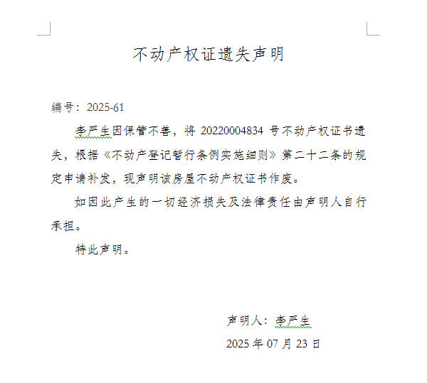 不動(dòng)產(chǎn)權(quán)證遺失聲明 編號(hào):2025-61